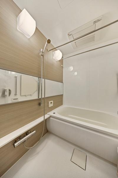 追い焚き機能でいつでも快適なバスタイムが楽しめます。天候を気にせずに洗濯物が乾かせる浴室乾燥機付き。【浴室】(2025年10月撮影)