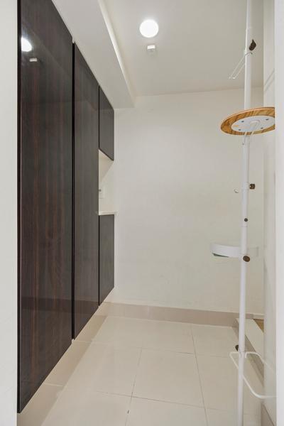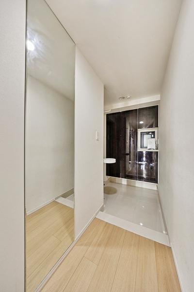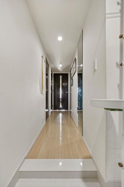 ※販売対象に家具・調度品は含まれません。収納力のあるコの字型の下足入あり。光が入る窓付き。廊下には姿見が備わっています。(2025年10月撮影)