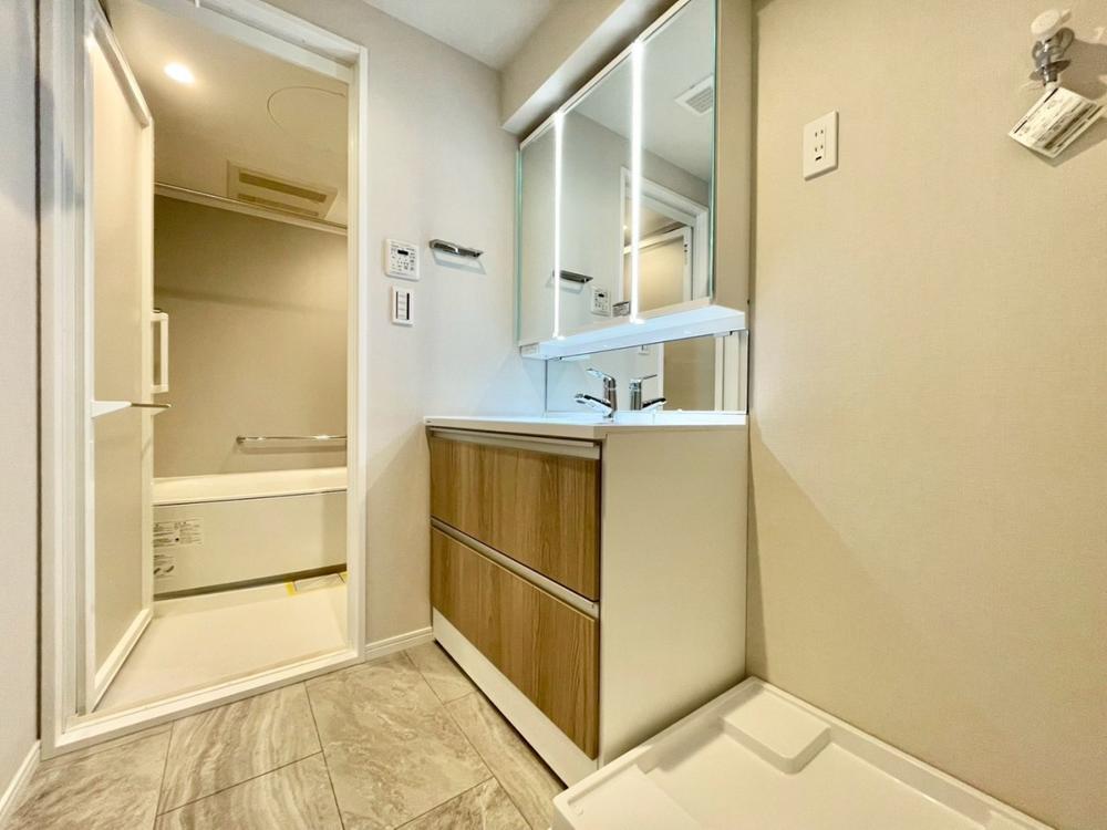 目線に合わせた三面鏡付洗面化粧台を採用しました。三面鏡の裏側には収納棚を確保。スキンケア用品やヘアケア用品などをすっきり整理できます。また収納棚を多く設けており、脱衣スペースを広く確保しております。