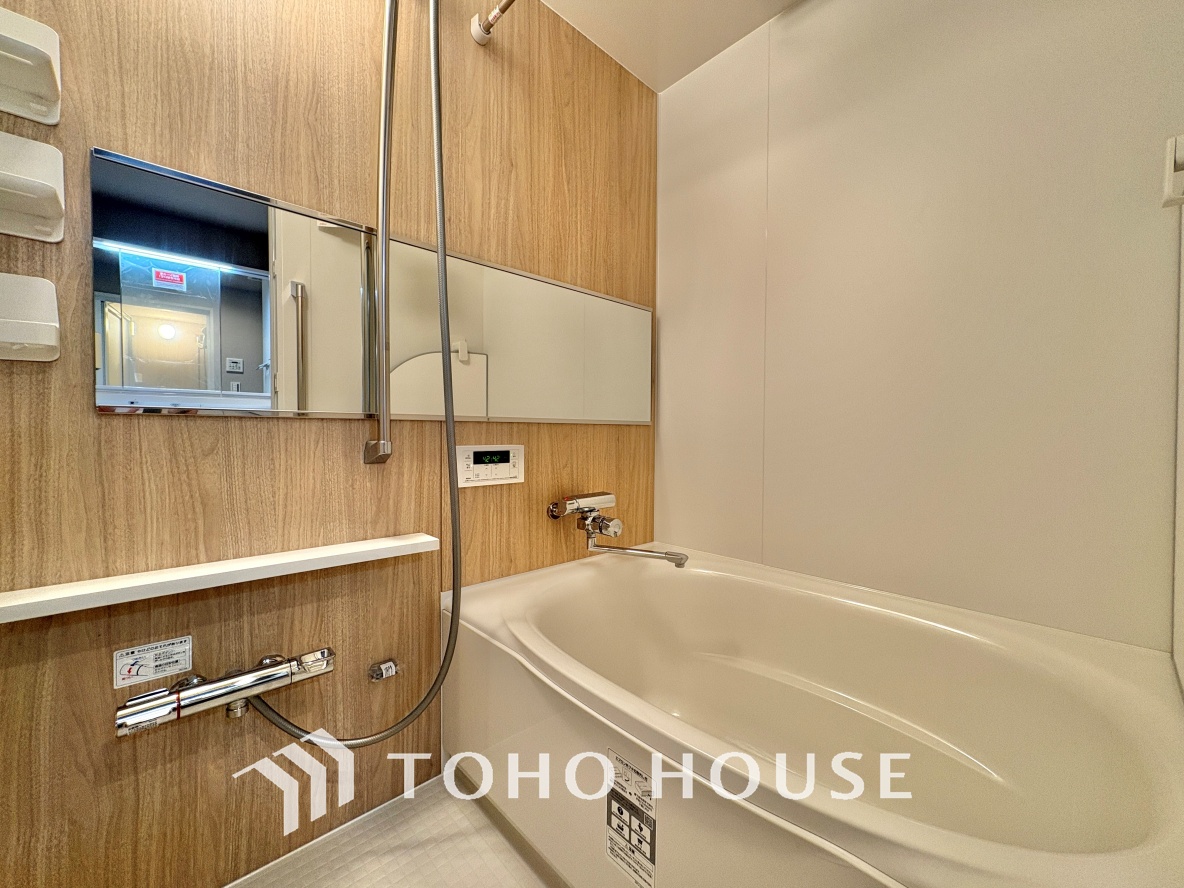 【浴室】《一日の疲れを落としてくれる場所は、落ち着く場所でなければならない》 高級感溢れるカラーと大きさ・柔らかな曲線で構成された半身浴も楽しめるバスタブが心地よさをもたらします。