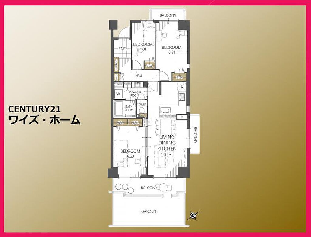 | 建物構造 | SRC(鉄骨鉄筋コンクリート) | 間取り詳細(帖) | リビングダイニングキッチン 14.5帖洋室 6.8帖洋室 6.2帖洋室 4帖 | ||