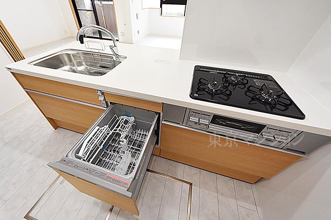 ナチュラルな雰囲気のシステムキッチン。浄水器や食器洗浄乾燥機、3口ガスコンロなど家事を快適&便利にしてくれる機能が搭載されています!☆即日内覧可能☆03-3789-7777