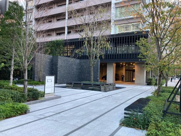 敷地内には手入れの行き届いた緑豊かな植栽が広がっています。落ち着いたグレーの外壁が印象的です。エントランス周辺は石畳が美しく整備され清潔感があります。周囲には高層マンションが立ち並んでいます。