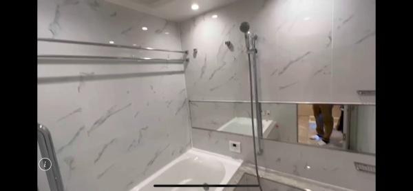 清潔感のある明るいバスルームです。壁面のデザインが空間に広がりを感じさせます。浴槽とシャワーがしっかり分かれていて使いやすい印象です。大きなミラーが設置されており毎日の身だしなみも整えやすいです。