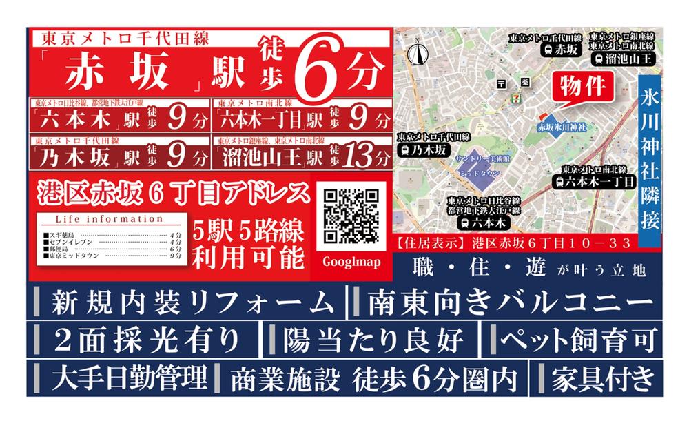 東京メトロ千代田線「赤坂」歩6分 東京メトロ南北線「六本木一丁目」歩9分 東京メトロ日比谷線「六本木」歩9分 | ||||