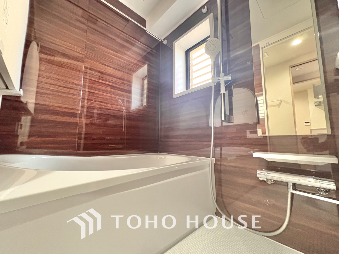 【浴室】《一日の疲れを落としてくれる場所は、落ち着く場所でなければならない》 高級感溢れるカラーと大きさ・柔らかな曲線で構成された半身浴も楽しめるバスタブが心地よさをもたらします。