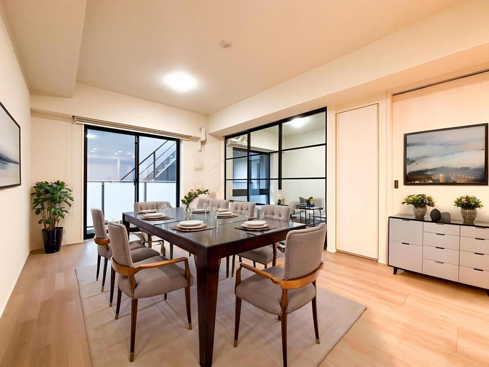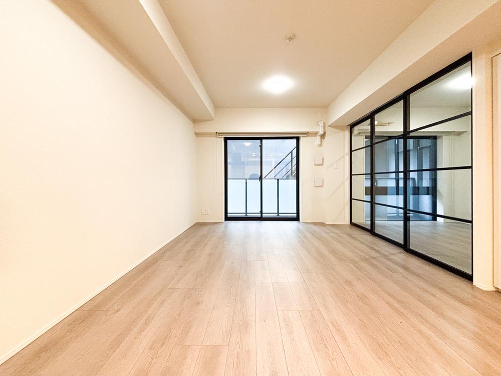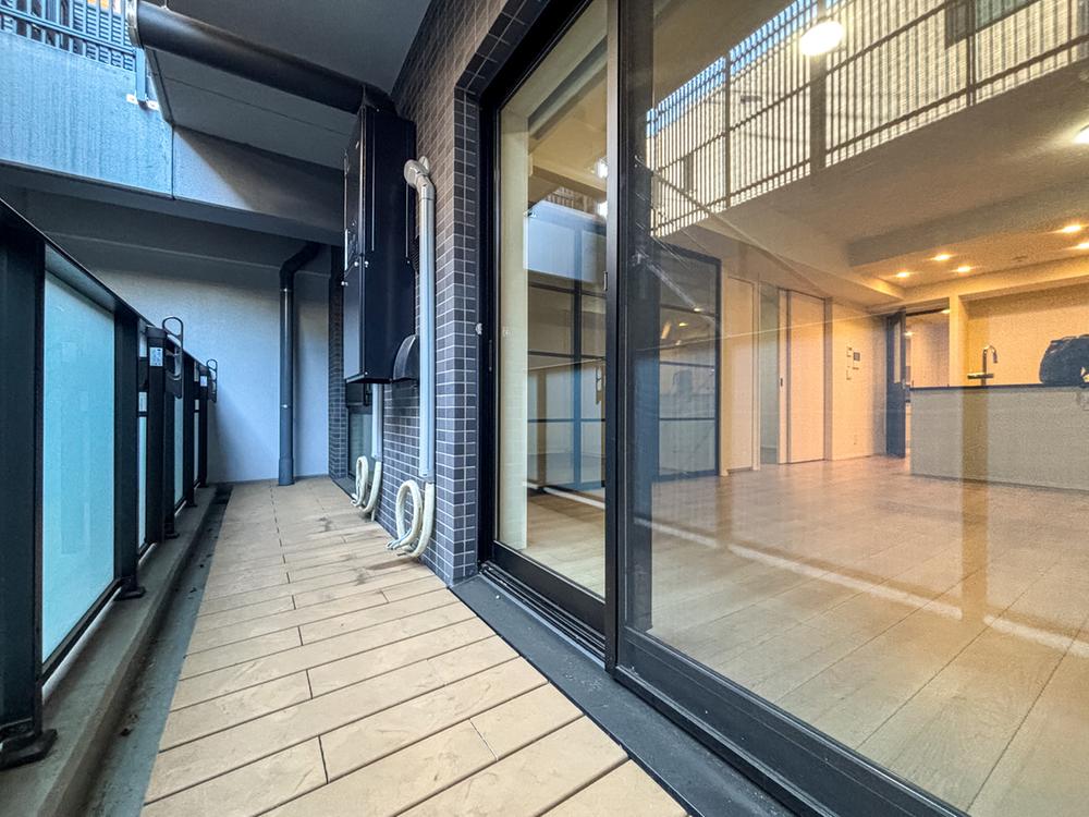 LDKと一体感のあるウッドデッキ調バルコニー。大きな開口部から光を取り込み、お部屋全体を明るく演出します。吉祥寺本町の静穏な住環境に馴染む、洗練されたプライベートバルコニーです。