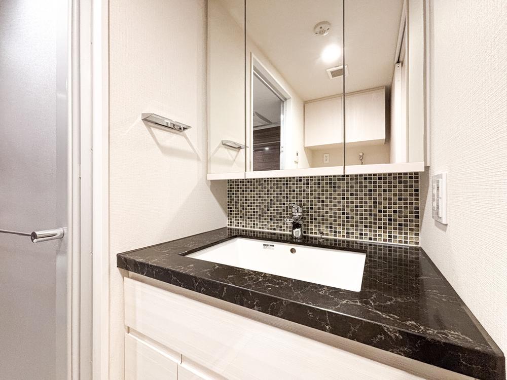 脱衣所に完備された三面鏡の洗面化粧台。朝の身支度や入浴前後に全身を確認することができる為、ストレスなく快適に使用できます。