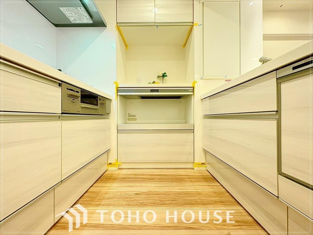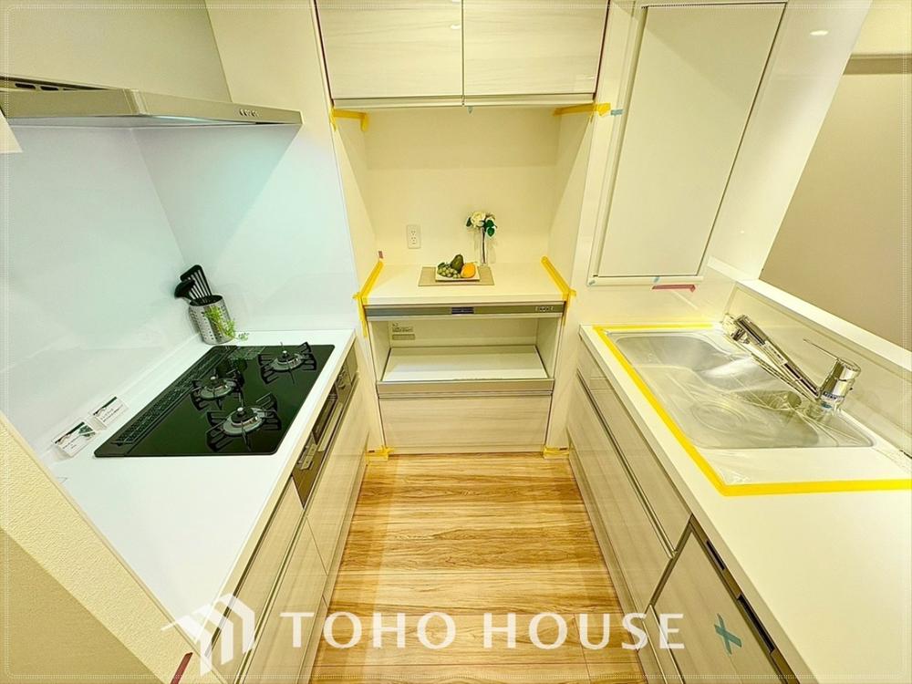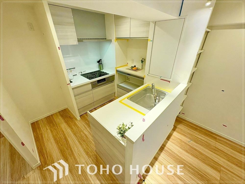 【会話も弾みます】キッチンは収納数もさる事ながら、リビングで寛ぐ家族や小さなお子様を見守りながら料理が出来る「対面式の温もり設計」。キッチンから立ち込める香りが今日の料理を期待させます。