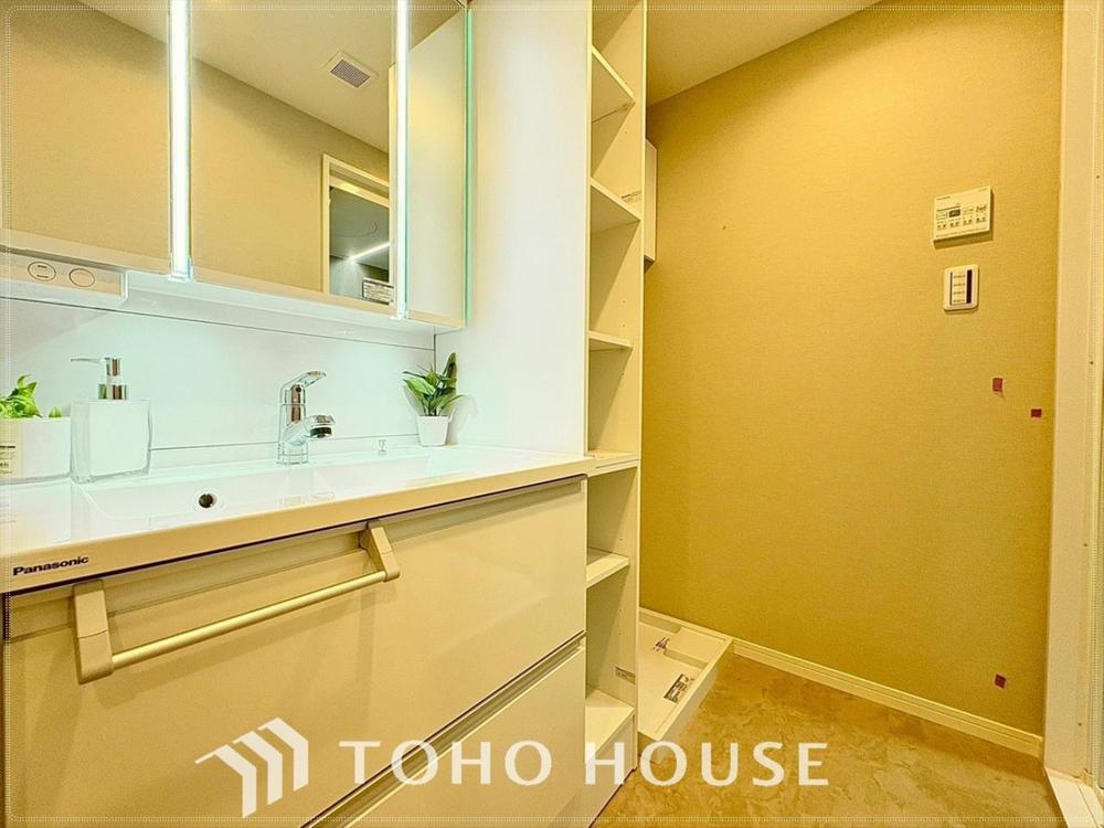 【身だしなみOK】シャワー機能付きの洗面台には使いやすい横長ボウル、スマートに収まる収納と充実しています。あわただしい朝の洗面タイムもばっちりです。