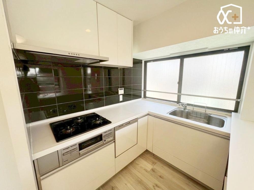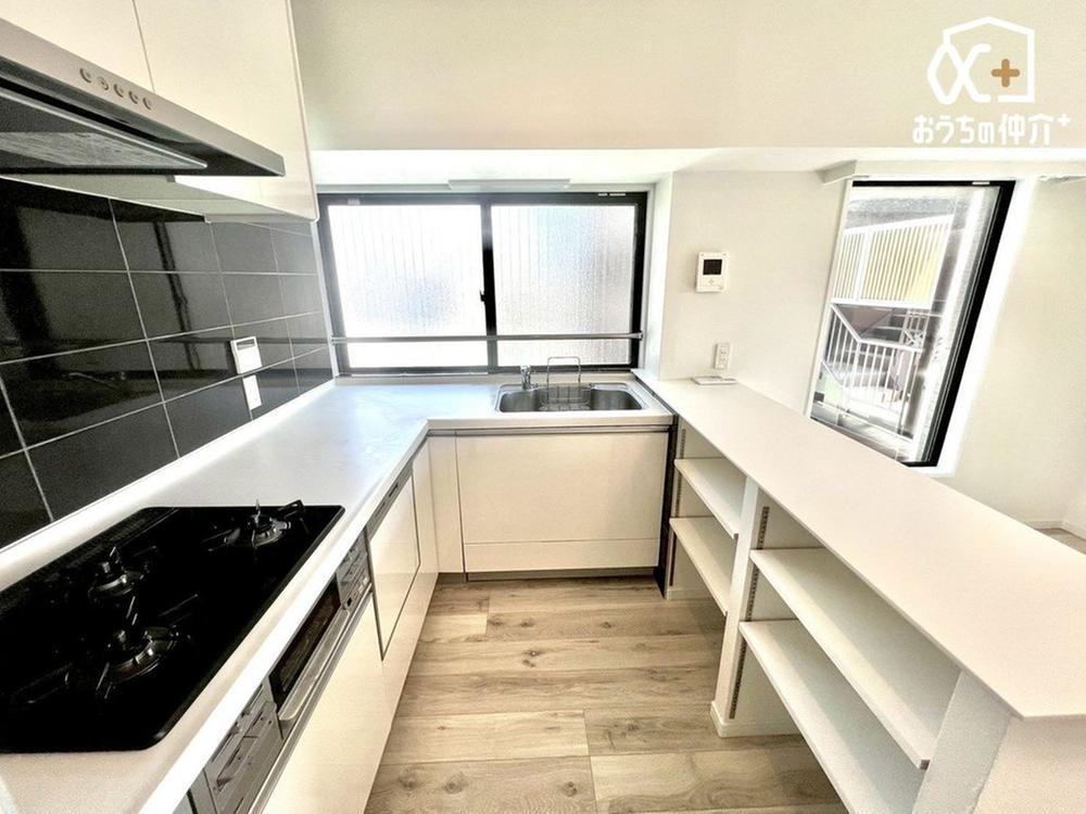 作業に集中できる壁付けキッチン。使いやすいL字型で作業効率もアップ!