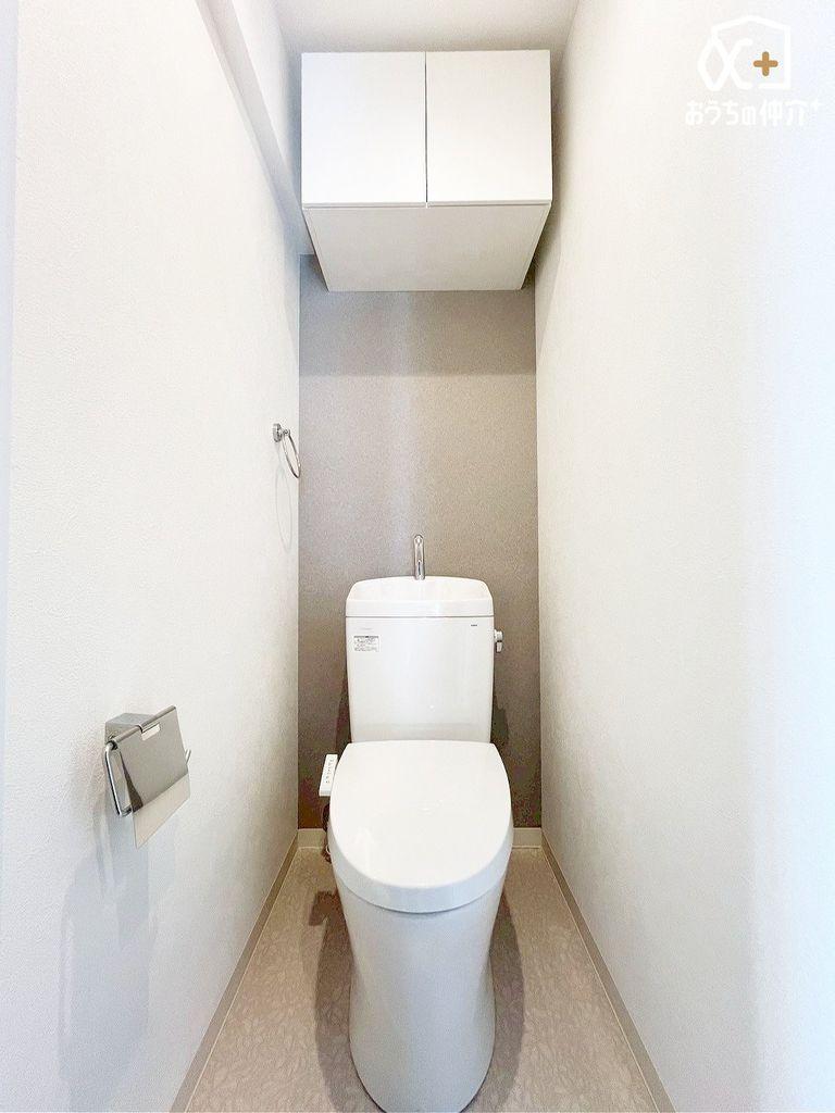 シンプルな内装のスッキリとしたトイレです。吊戸棚もあり、すっきり片付きます。