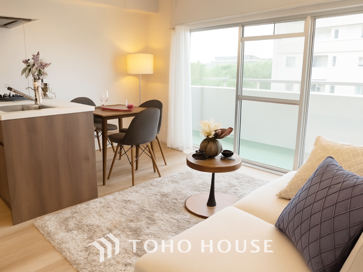 【Bouncy conversation】 パートナーや家族が集う憩いの空間。真新しい木目のフローリングや白亜のクロスを陽の光、ダウンライトが照らし出し、家族・友人・知人の会話に華を咲かせます。