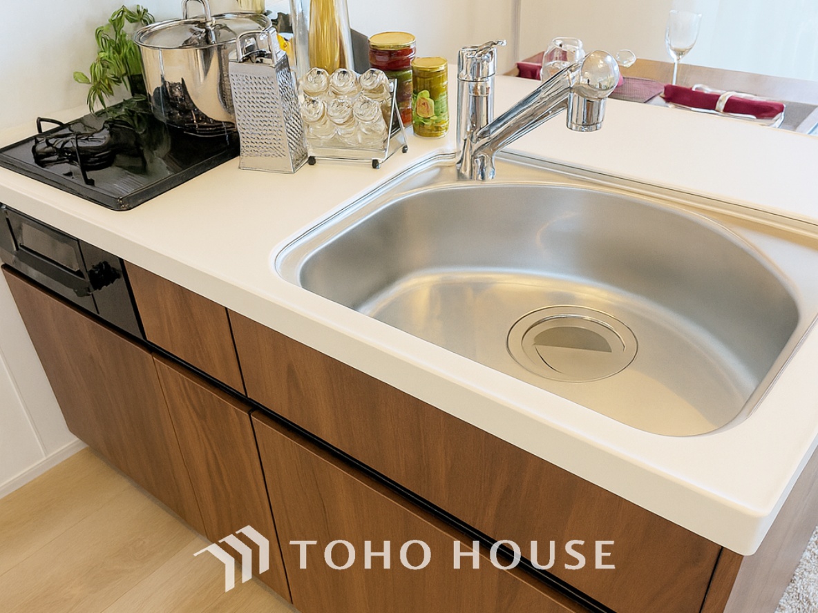 【Kitchen】美しく使いやすいキッチンは油汚れが簡単に拭き取れる素材で加工されており、浄水器シャワーから流す水の音を軽減する静かなシンクを採用。*配置してある家具や小物はCGによるイメージ画像です