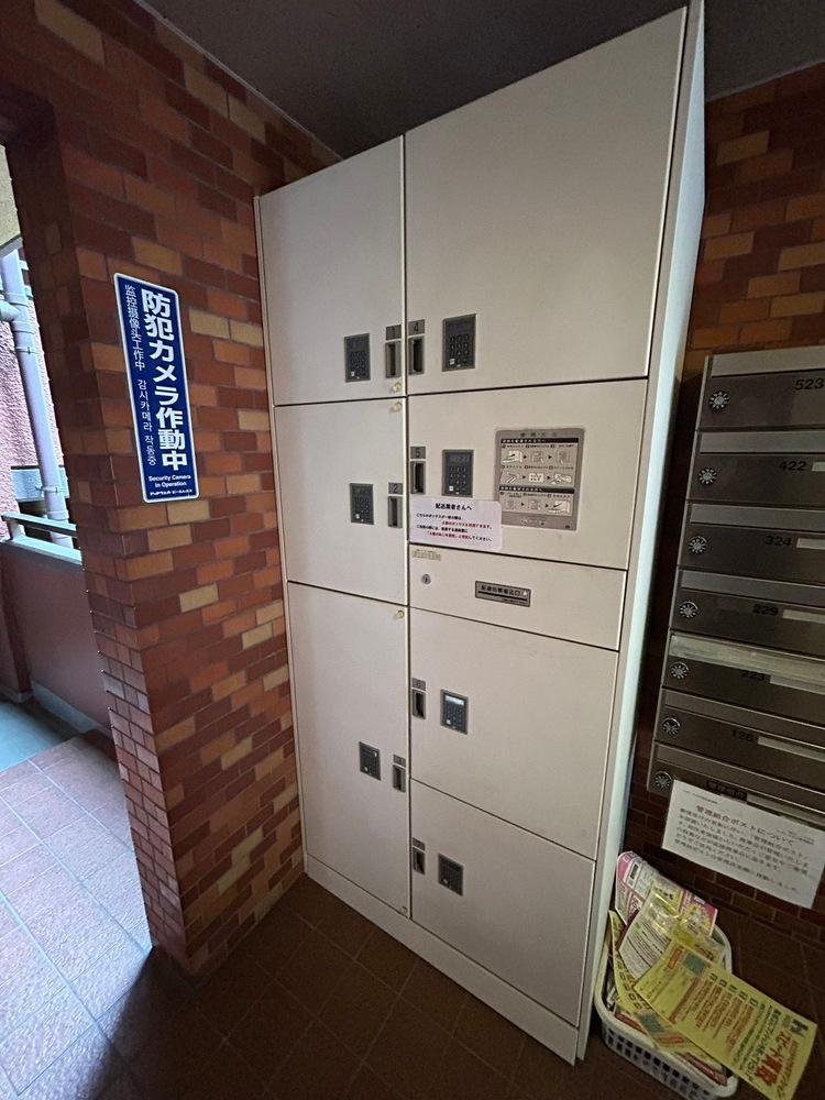 【エントランス/共用部】重厚感のある共用エントランス。入口に屋根がありますので、傘をさして帰ってきた際、慌てずに傘を閉じることができます。不在時も荷物の受け取りが可能な宅配BOXがございます。