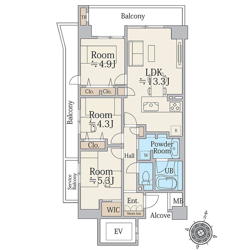 | 建物構造 | SRC(鉄骨鉄筋コンクリート) | 間取り詳細(帖) | 洋室 4.9帖洋室 4.3帖洋室 5.3帖リビングダイニングキッチン 13.3帖 | ||
