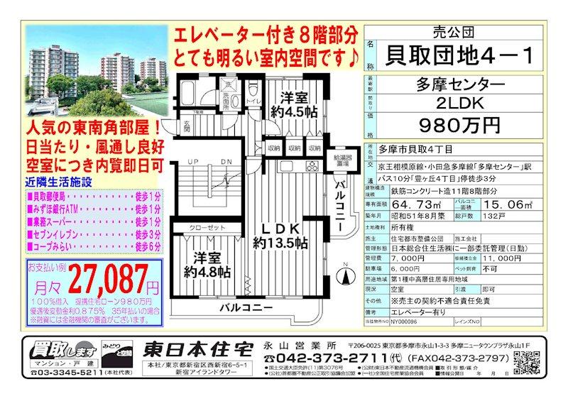 京王相模原線「京王多摩センター」バス10分豊ヶ丘四丁目歩3分 小田急多摩線「小田急多摩センター」バス10分豊ヶ丘四丁目歩3分 | ||||