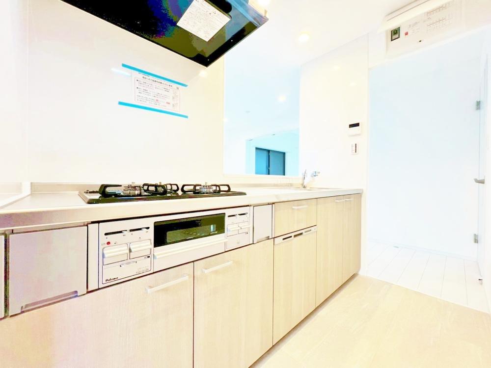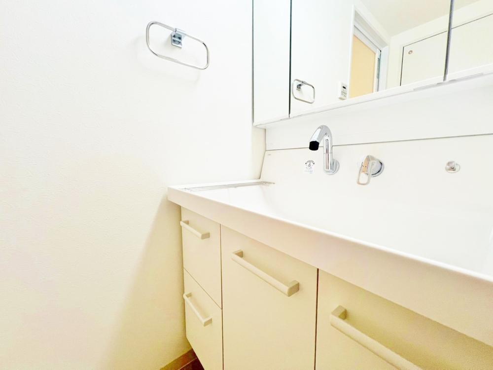 大きく見やすい三面鏡で清潔感ある洗面台。収納も多く、コスメ等もスッキリと仕舞えます。キッチンに隣接した位置関係ですので、家事動線もよく、ご家族のコミュニケーションが生まれ易い配置となっています。