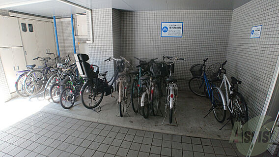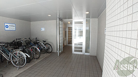 おしゃれな外観でマンション外壁の青いラインが気に入りました。 自転車はまぁごちゃごちゃしてたけど、単身者が多そうなマンションなので許容範囲内でした。