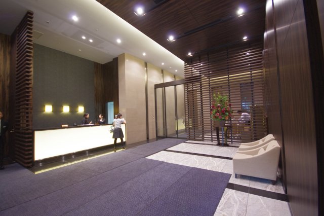 24時間のフロントサービスがあり、宅配便やクリーニングの依頼と受け取り、タクシーの予約をやってもらえる。来客の取りつぎはフロントを介して行い、エレベータは居住者でも専有階にしか停止しないので、玄関に不意に人が訪れることはなく、セキュリティは高い。