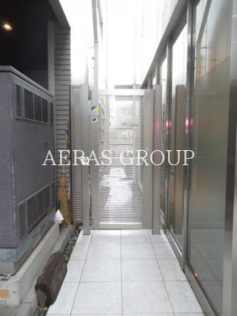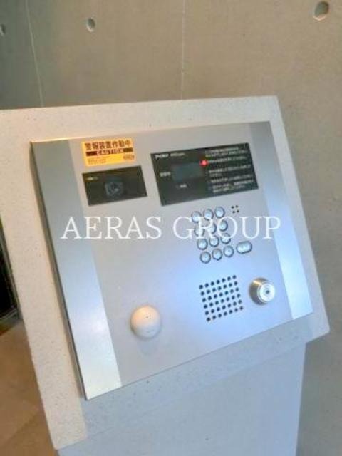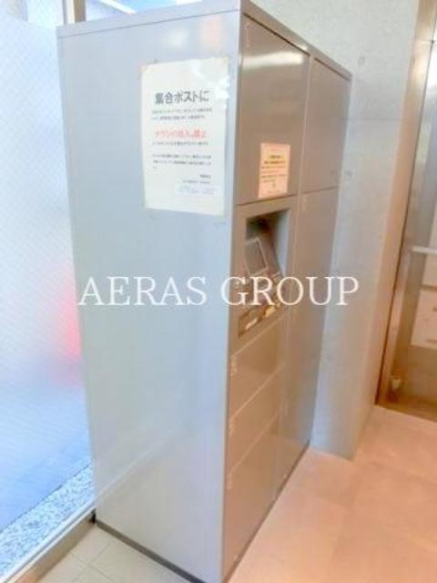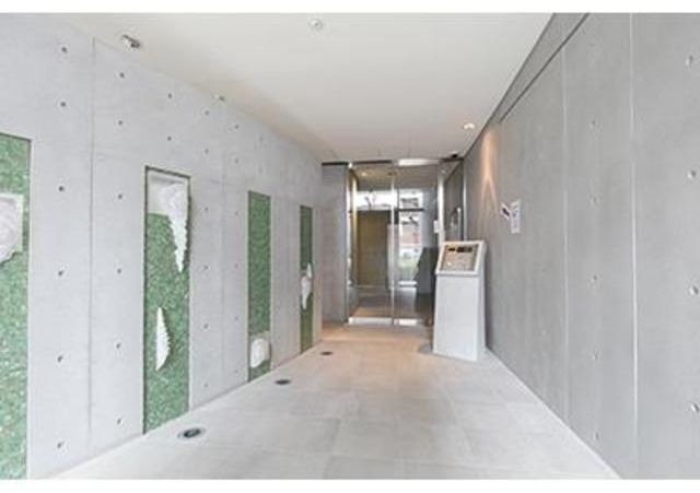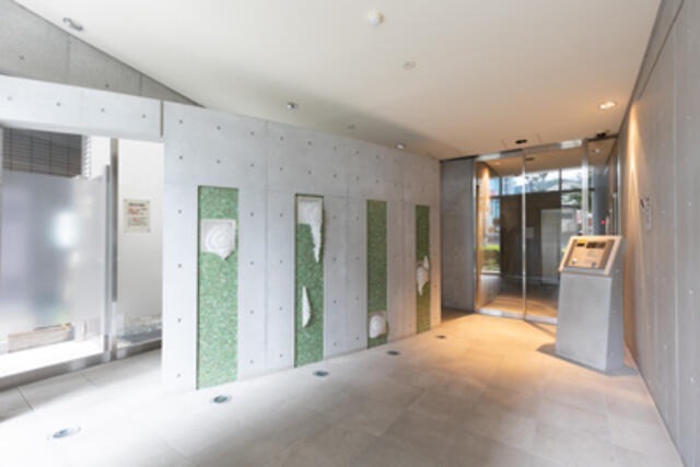 オートロックのエントランスは、コンクリート調のシンプルなデザインです。管理人はいませんが、防犯カメラが設置してあります。宅配ボックスがあります。
