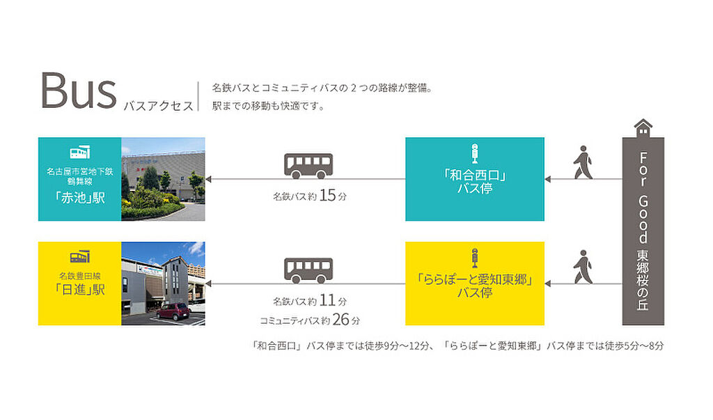 名鉄豊田線「赤池」駅 名鉄バス乗車約15 分「和合西口」バス停(赤池行き) 徒歩9分~14分 名鉄豊田線「日進」駅 名鉄バス乗車約11分「ららぽーと愛知東郷」バス停 徒歩6分~8分 「ららぽーと愛知東郷」バス停 徒歩6分~8分 | ||||