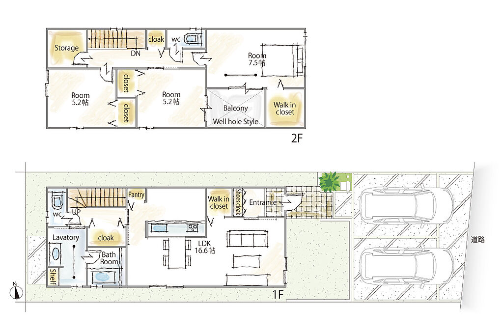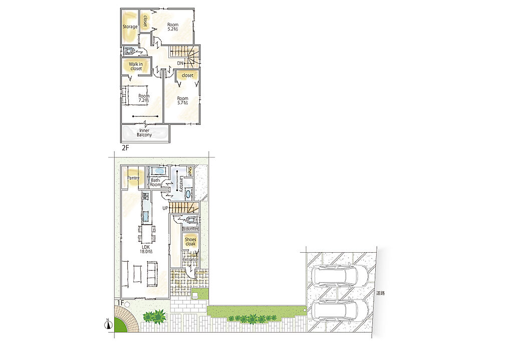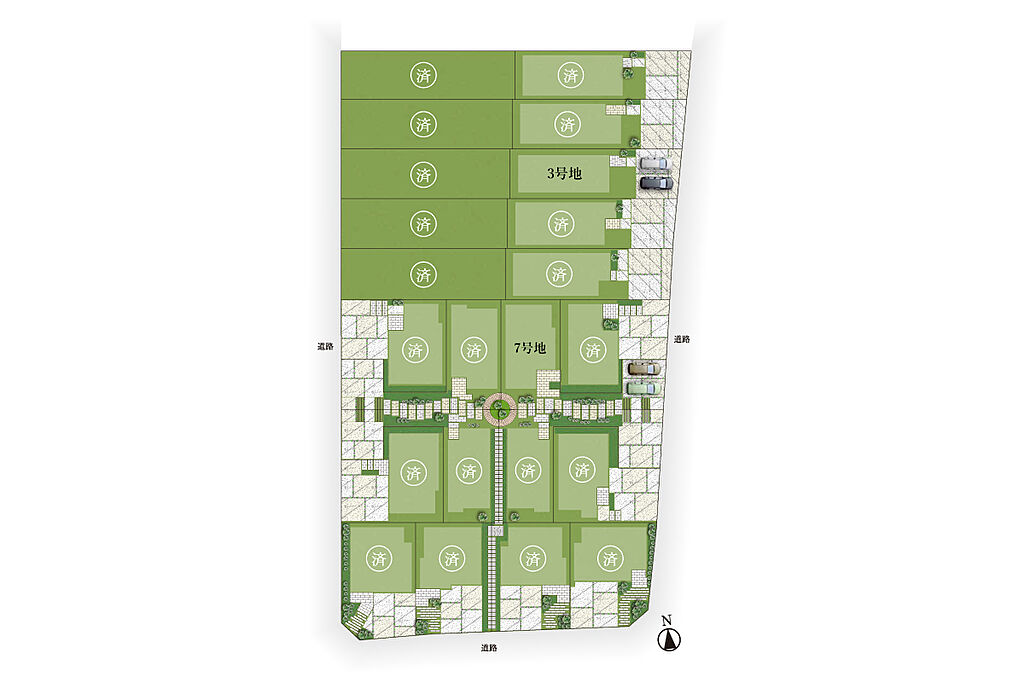 建物面積 | 98.55m2~107.67m2(7号地インナーバルコニー4.96m2を含む) | 土地面積 | 120.50m2・138.51m2 | ||