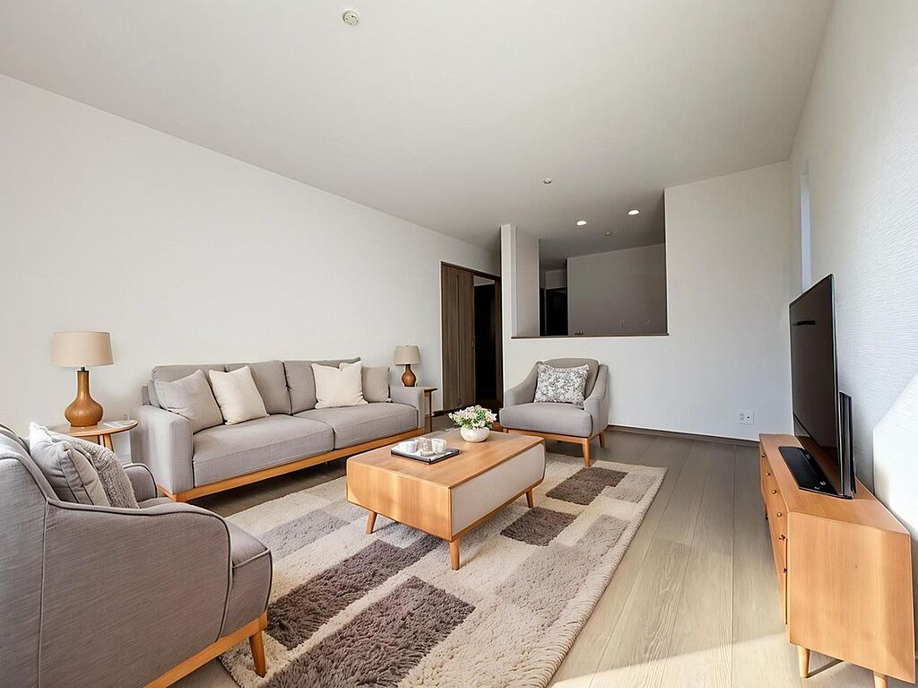 【J棟】広々とした明るいリビング♪対面式のオープンキッチンは、家事をしながら家族の様子が一目でわかる安心&便利設備です♪※家具をCGで加工しています。家具付き販売ではございません。