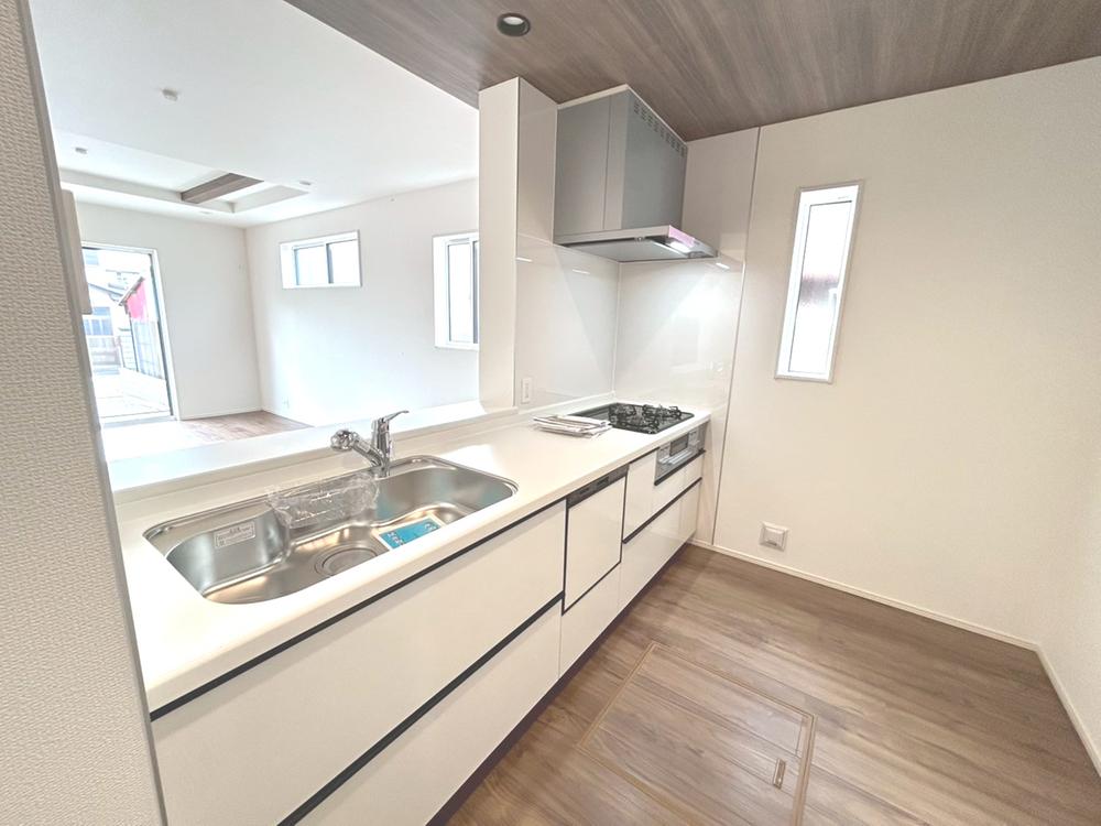 (1号棟)お手入れがラクなステンレスをワークスペース部分トップに使用した、機能的で美しいシステムキッチンです。浄水器組込み水栓でシンクまわりがスッキリ広々お使いいただけます。フラットな造りでお掃除も