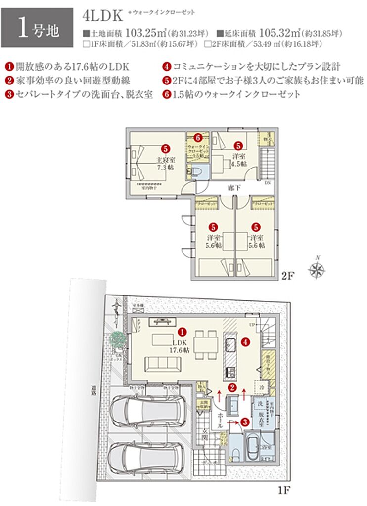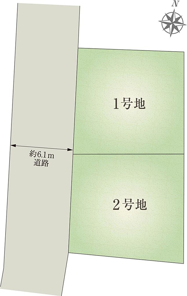| 建物面積 | 105.32m2(1号地)、105.32m2(2号地) | 土地面積 | 103.25m2(1号地)、108.34m2(2号地) 全て私道負担なし | ||
