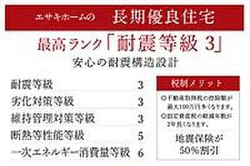 国が定めた長期優良住宅に対応。長期にわたり良好な状態で住まうことができる優良な住宅です。また、耐震等級は最高ランクの等級3を取得。安心の耐震構造設計です。税制面での優遇も受けられます。