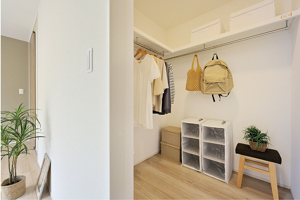 主寝室の収納には、ウォークインクローゼットを標準としています(形状は各邸異なります)。皺を避けたい衣類や、重ね置きをしたくない物、嵩張る物などの収納に便利です。