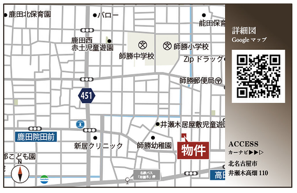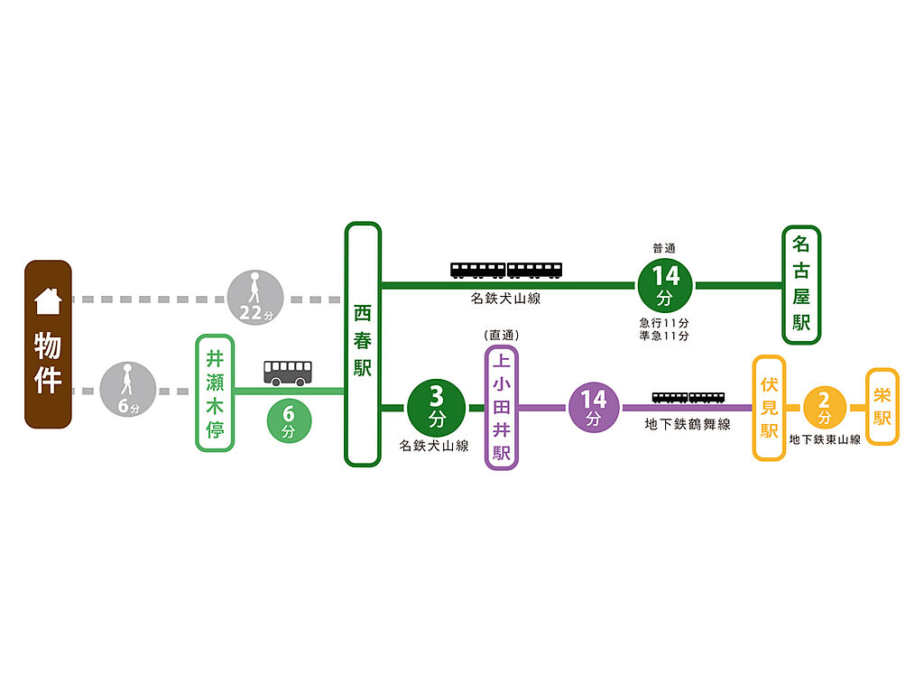 名鉄犬山線「西春」駅 徒歩22分 名鉄犬山線「西春」駅 名鉄バス6分「井瀬木」停 徒歩6分 名鉄犬山線「徳重・名古屋芸大」駅 徒歩34分 | ||||