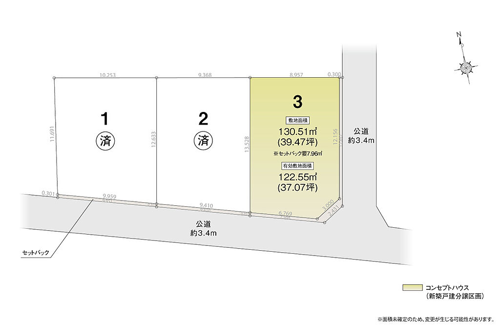 | 道路付け | 南側公道約3.4m、東側公道約3.4m ※セットバック要 面積は備考欄に記載 | 機構融資 | - | ||