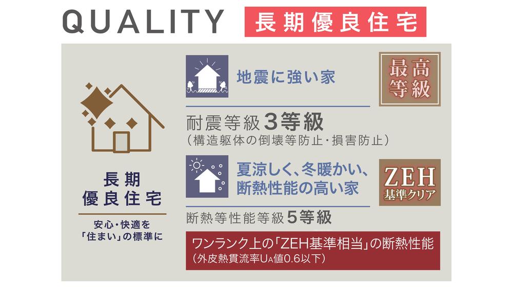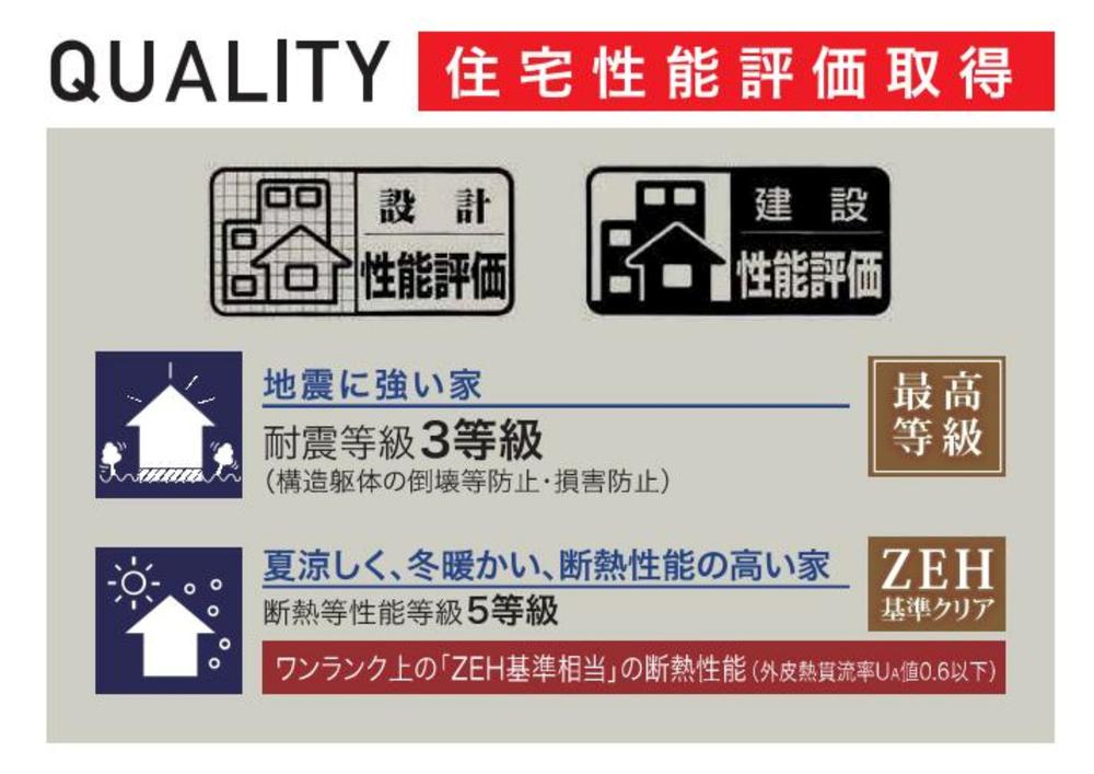 | 設備 | 設計住宅性能評価書 / 建設住宅性能評価書(新築時) / フラット35・S適合証明書 / 省エネルギー対策 / 高気密高断熱住宅 / 地盤調査済 / 駐車2台可 / 2沿線以上利用可 / LDK18畳以上 / 省エネ給湯器 / 市街地が近い / 南向き / システムキッチン / 浴室乾燥機 / 陽当り良好 / 駅まで平坦 / 南側道路面す / 閑静な住宅地 / 前道6m以上 / 角地 / 整形地 / シャワー付洗面化粧台 / 対面式キッチン / ワイドバルコニー / バリアフリー / トイレ2ヶ所 / 浴室1坪以上 / 2階建 / 南面バルコニー / 床下収納 / 浴室に窓 / TVモニタ付インターホン / 都市近郊 / 前面棟無 / 通風良好 / 全居室フローリング / パントリー(食器・食品の収納庫) / ウォークインクローゼット / 全居室複層ガラスか複層サッシ / 都市ガス / 平坦地 / 食器洗乾燥機 / 浄水器 / スマートキー / 高機能トイレ | ||||