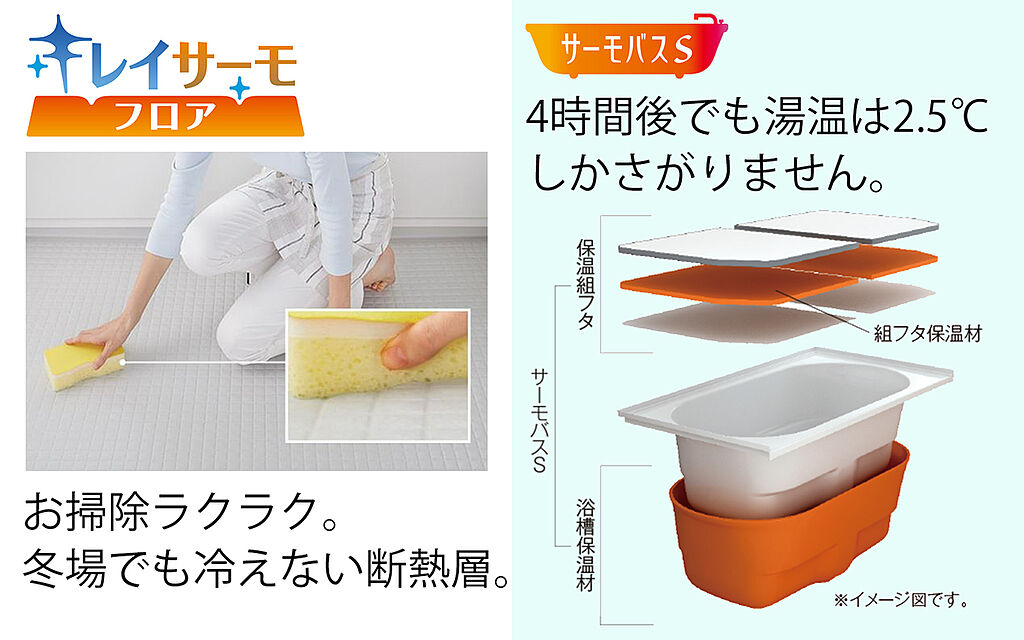 【キレイサーモフロア】スポンジが奥まで入り、お掃除ラクラク。独自の断熱層で寒い冬場でもヒヤッとしません。【サーモバスS】浴槽保温材と保温組フタのダブル保温で、時間が経っても浴槽内の温度を最小限に抑えます。半身浴のできるベンチ付きの節水型の浴槽、排水口はシャワーなどの排水時に渦を起こして髪の毛やゴミをまとめてくれるためお掃除簡単で汚れもつきにくい構造になっています。