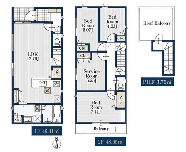 ルーフバルコニー付。LDKはゆとりある17畳。並列駐車2台可能な新邸です。