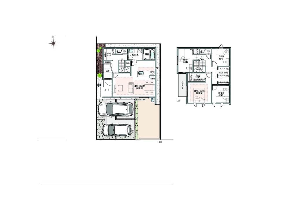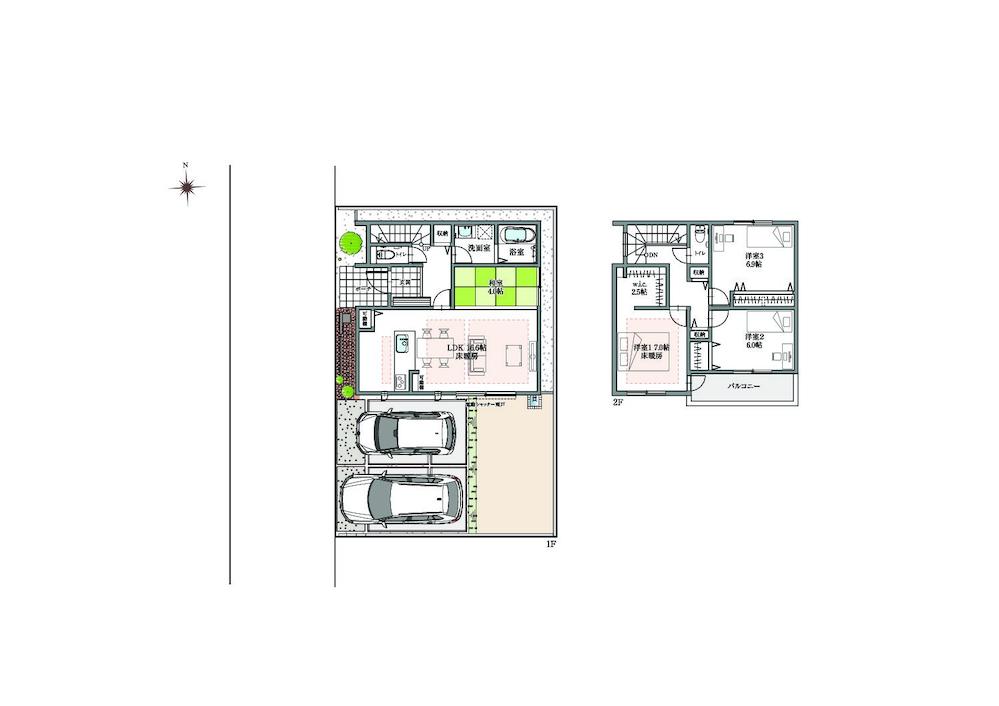 | 建物面積 | 104.35㎡・109.73㎡(31.56坪・33.19坪) | 土地面積 | 127.69㎡(38.62坪) | ||