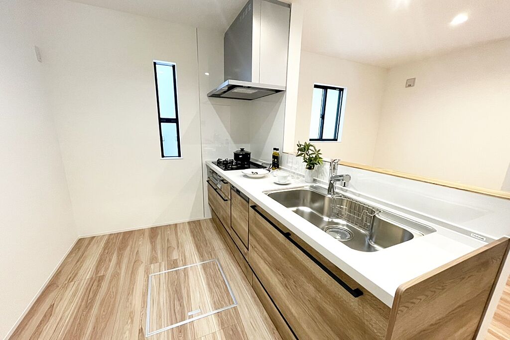 横幅2,550ミリのワイドタイプのシステムキッチン。食器洗い乾燥機付きです。構造体が「ステンレス」で設計されている為、経年劣化による腐敗やにおいを気にする必要のない、ランニングコストにも優れたキッチンとなっています。