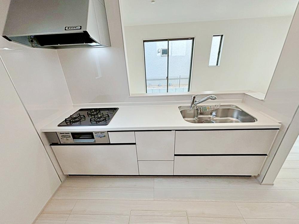 A号棟収納力豊富なシステムキッチン。大型スライド収納付きで、すっきり片付けやすいキッチンです。床下収納もついています♪