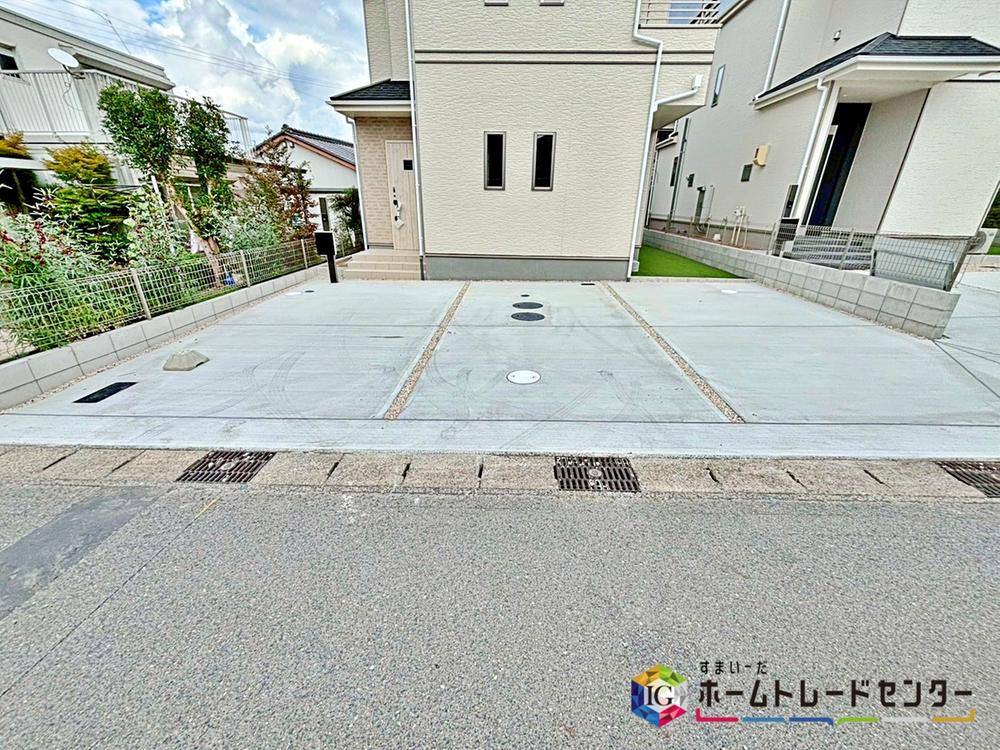 A号棟並列3台駐車可能スペースを確保しました☆来客時も安心です♪セカンドカー用にされてもいいですね♪交通量が少なく、ゆとりをもって駐車できます。駐車が必要ないスペースは他の用途多数!