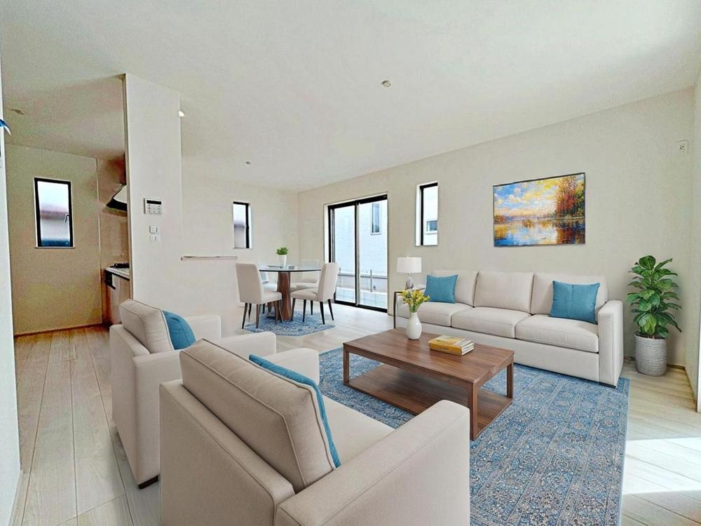 A号棟明るい雰囲気が心地いい約16.62帖のリビング♪ 採光良好です! 家族団らんの時間も増えそうなくつろぎの場所になりそう♪※家具をCGで加工しています。家具付き販売ではございません。