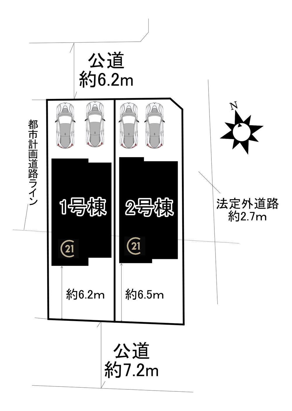 | 地目 | 宅地 | 道路付け | 道路幅:2.7m~7.2m、アスファルト舗装、南側約7.2m公道、北側約6.2m公道、東側約2.7m(法定外) | ||
