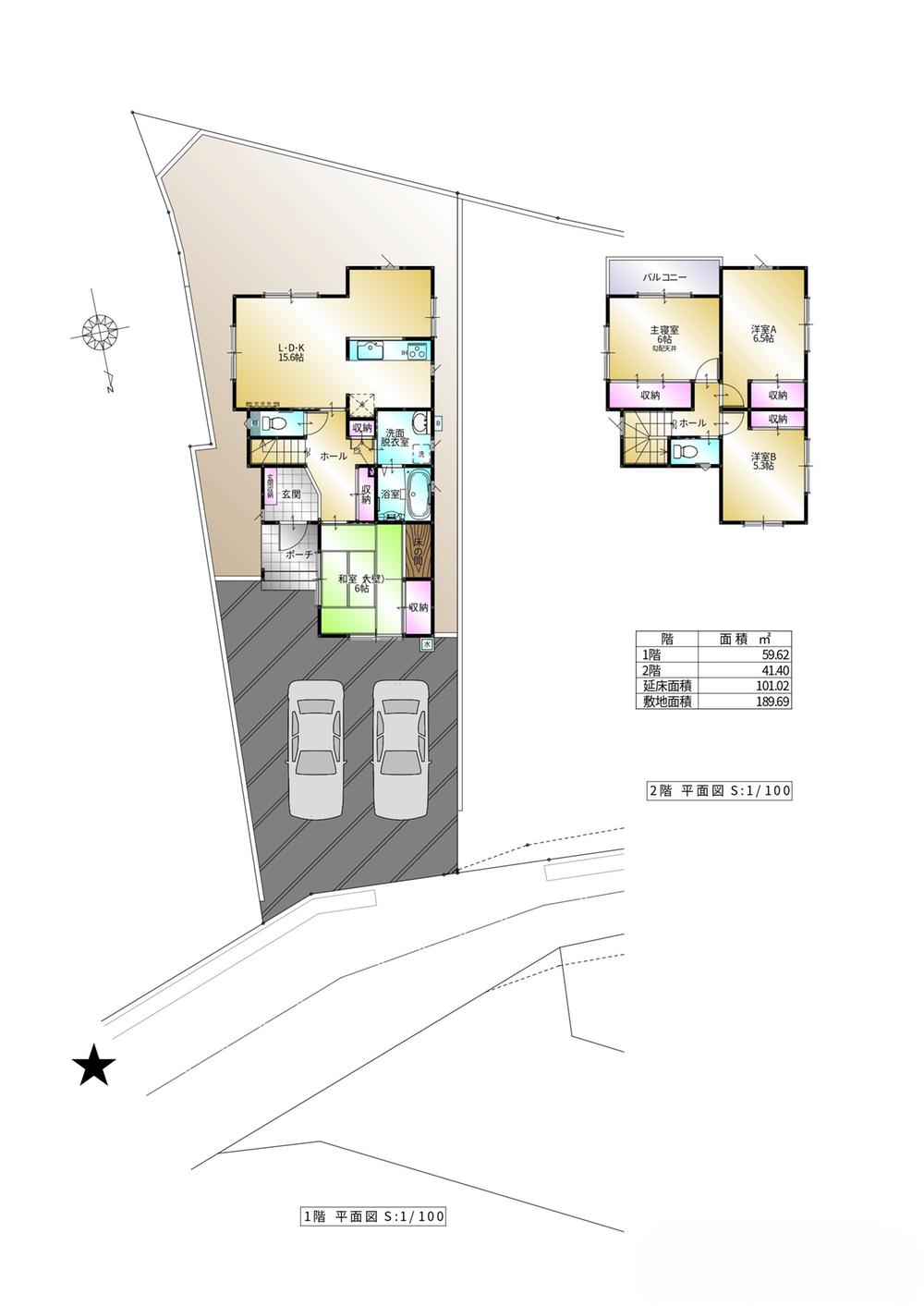 | 建物面積 | 98.54㎡~101.02㎡(実測) | 土地面積 | 153.89㎡~187.12㎡(実測) | ||