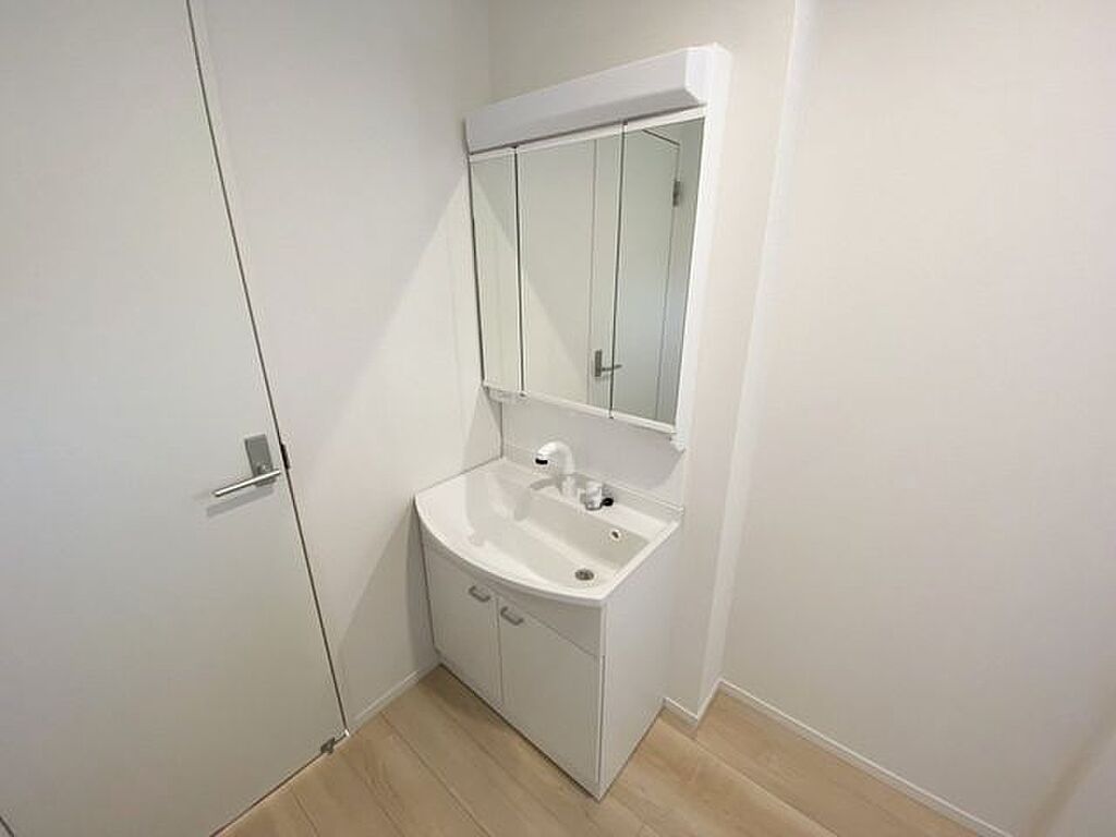 室内(2025年10月)撮影◎本日案内可能◎三面鏡裏収納がついた洗面化粧台。見せない収納ができる便利な仕様です♪