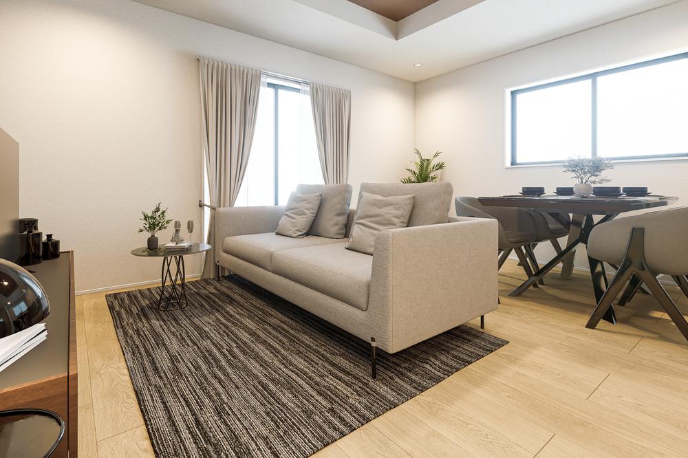 約18.5~19帖のLDKは3面採光!南に面した大きな窓から陽が射し込みます。1号棟※パースはイメージ画像の為、実際と多少異なる場合がございます。絵中の家具・調度品等は販売対象には含まれません。
