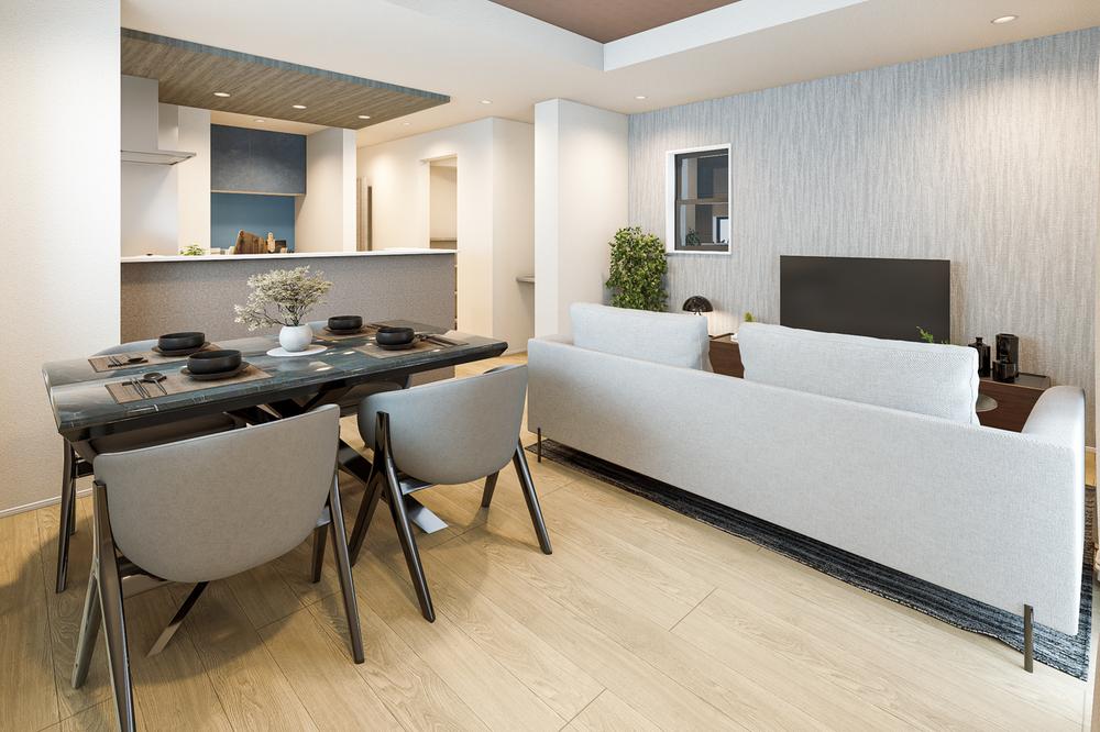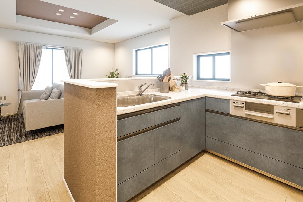 対面キッチンは、リビングで寛ぐご家族との会話を楽しめます。1号棟完成予想図※パースはイメージ画像の為、実際と多少異なる場合がございます。絵中の家具・調度品等は販売対象には含まれません。