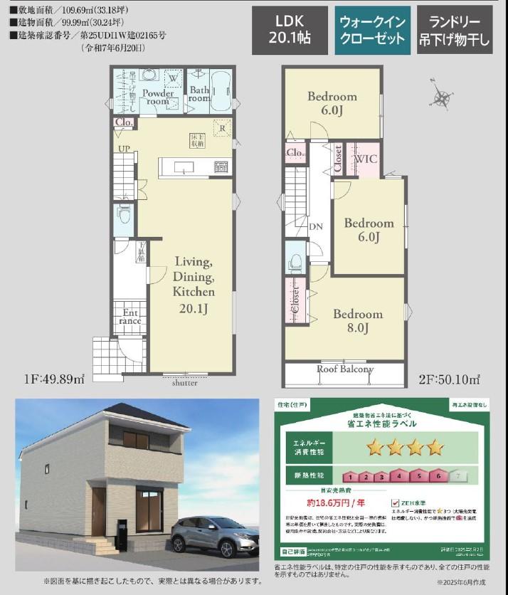 | 建物面積 | 96㎡~99㎡(実測) | 土地面積 | 109㎡~124㎡(登記) | ||