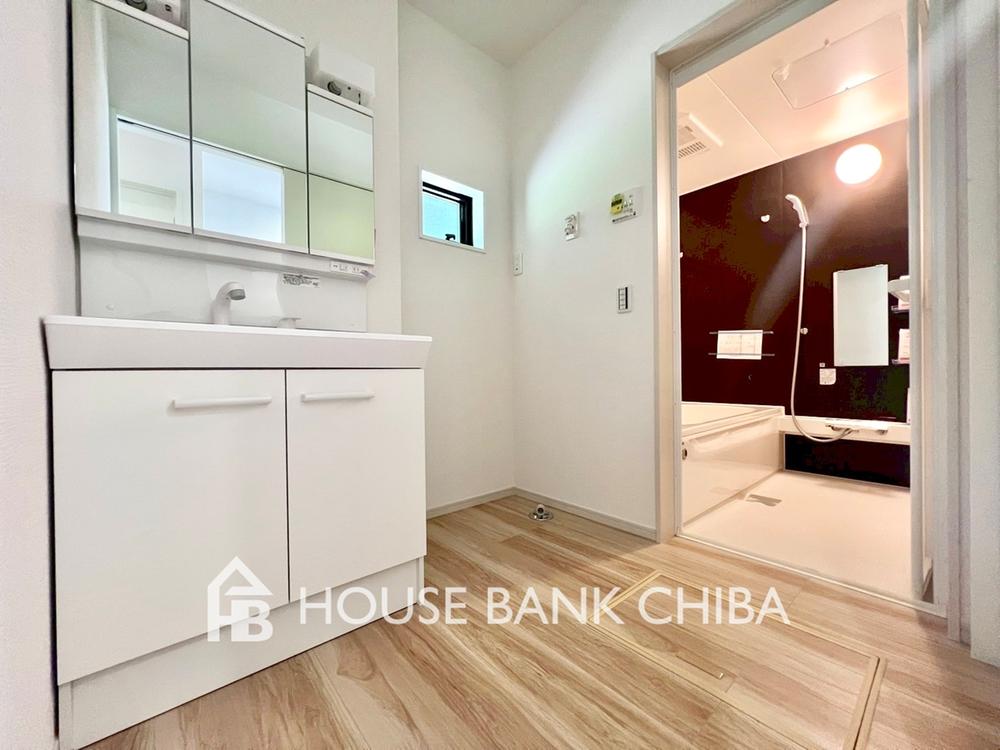 洗面台には三面鏡のある仕様です。快適に身だしなみを整えやすく、鏡の後ろの収納スペースには、歯磨き粉等のアメニティ類を収納可能。散らかりやすい洗面スペースもスッキリ整理整頓することができます。