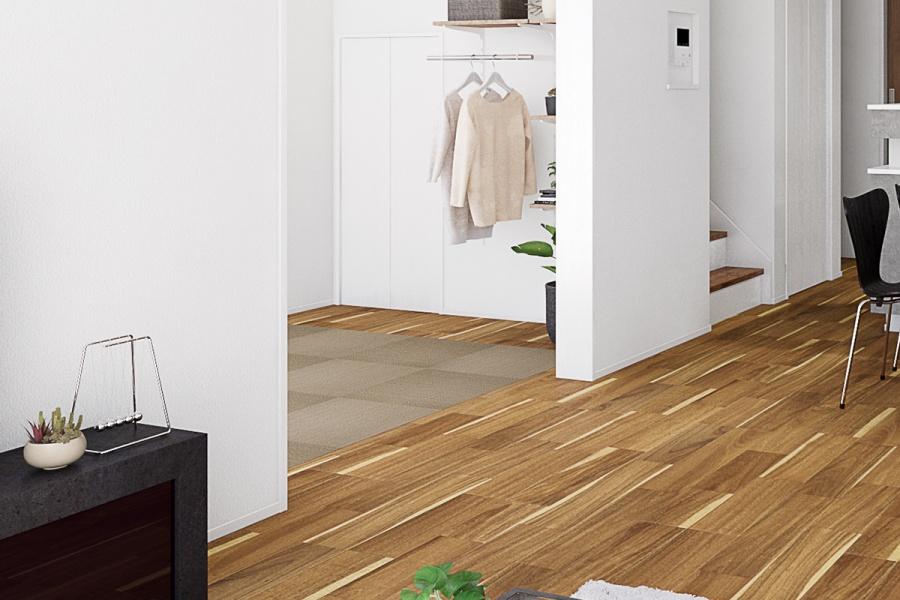 【木のぬくもりと寄り添いながら自分らしい暮らしを描く】庭や街の木々を取り込んだような3種の個性ある木材を空間のアクセントに、家族と過ごす時間もひとりの時間も大切にできる3つのプランを採用しました。